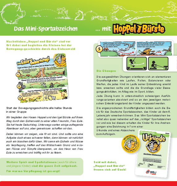 Begleitet Hoppel und Bürste auf ihrem Weg durch Eichenwald und erlebt einige Abenteuer dabei. Die ausgewählten Übungen orientieren sich an elementaren Grundfertigkeiten wie Laufen, Rollen, Balancieren oder Werfen, die jedes Kind im Laufe seiner Entwicklung erwirbt bzw. erwerben sollte und die Grundlage vieler Bewegungsaktivtäten, im Alltag wie im Sport, bilden.
