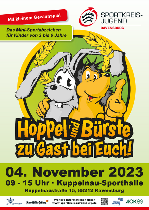 Die beiden Maskottchen Hoppel und Bürste kommen am 04.11. in die Kuppelnauhalle, um mit Kindern von 3-6 Jahren das Mini-Sportabzeichen abzulegen.