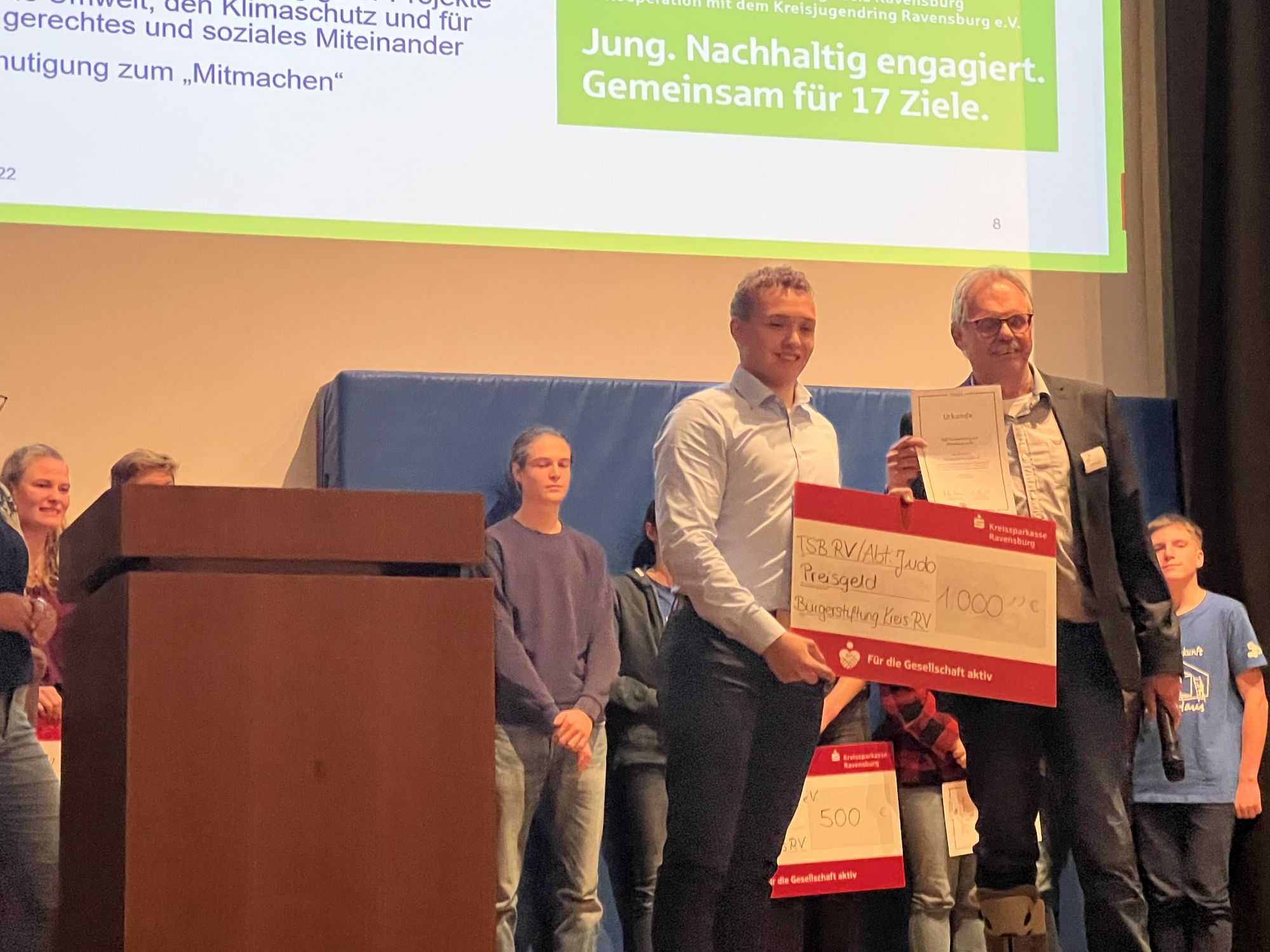 „Preisgekrönt 2022“ wurde hier am vergangenen Donnerstag in der Mensa der Gymnasien Ravensburg auch das Angebot der TSB Judoka, die mit ihrem Projekt Judo der sanfte Weg für ALLE MENSCHEN mit 20 Mitbewerbern in die Auswahl genommen wurden. Am Ende wurden die TSB Judoka mit dem dritten Platz und einem Preisgeld von 1.000 Euro belohnt.