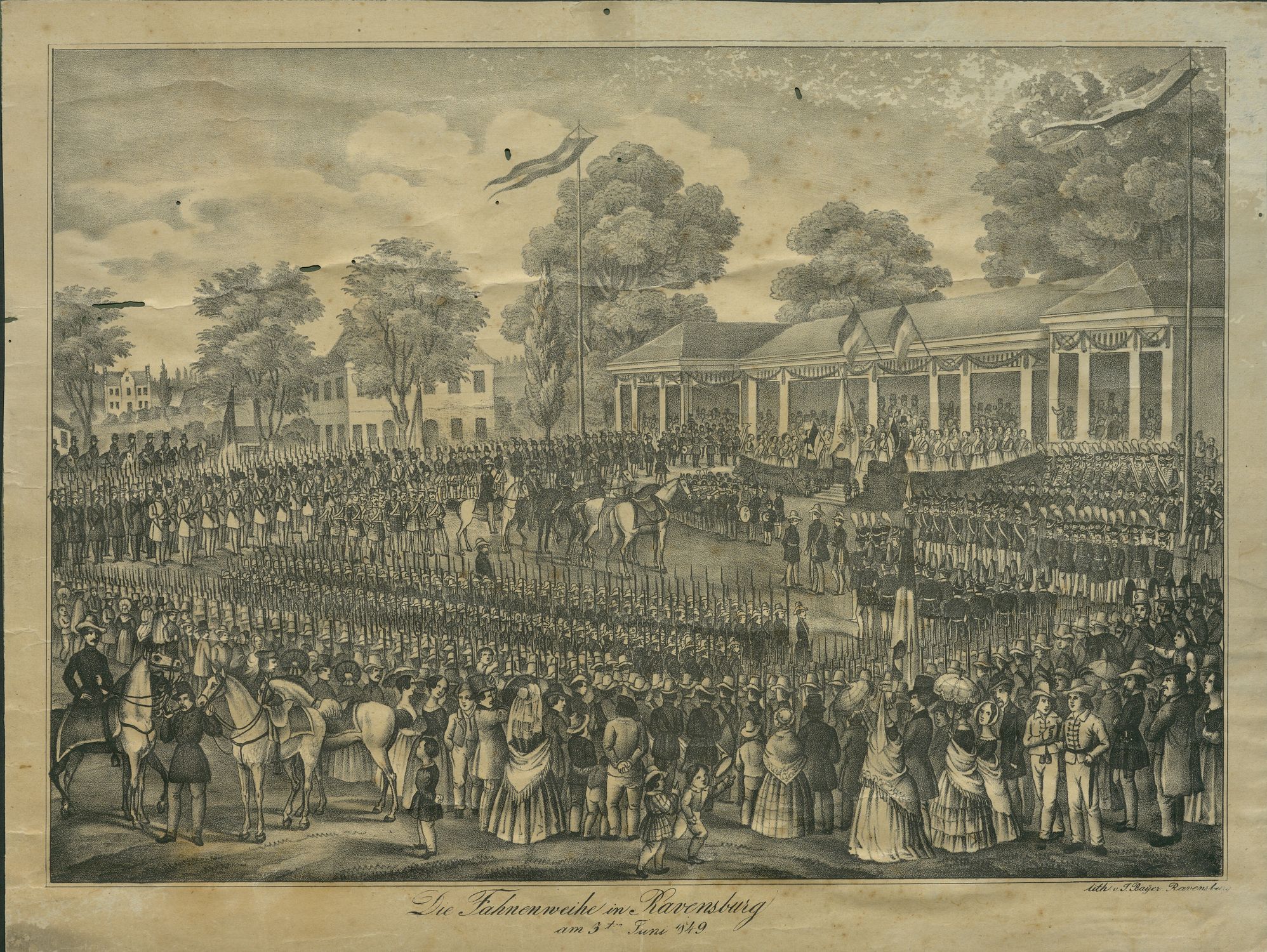 Die Lithographie von Joseph Bayer (1820-1879) zeigt die Weihe der Fahne der Ravensburger Bürgerwehr am 3. Juni 1849. In dieser Bürgerwehr waren die Turner der 1847 gegründeten Turngemeinde Ravensburg stark vertreten. Im Vordergrund rechts sind zwei Turner in ihrem typischen Turneranzug aus ungefärbten Leinen mit markantem Turnerhut abgebildet.